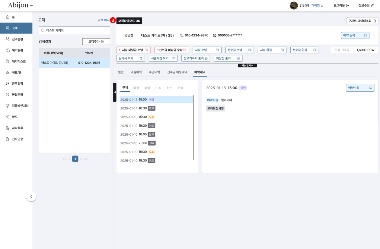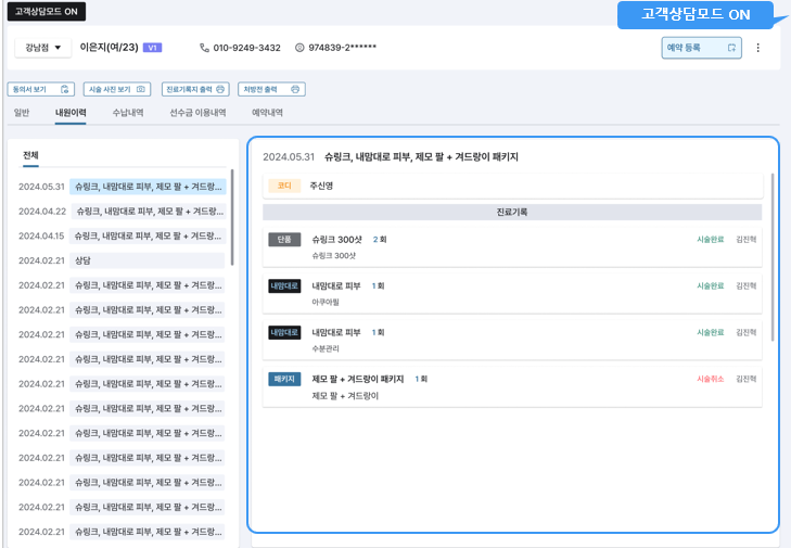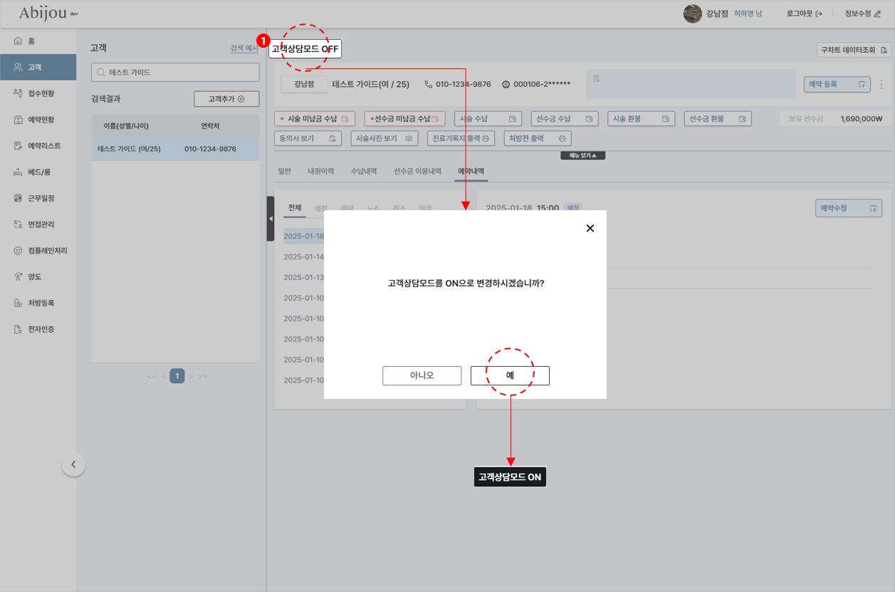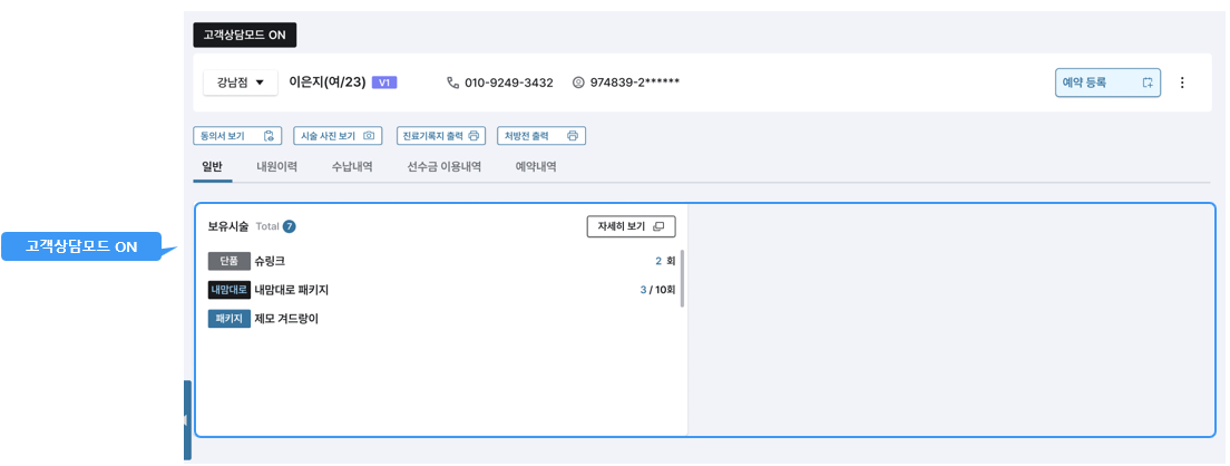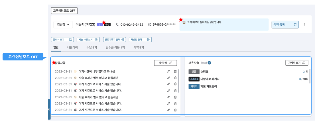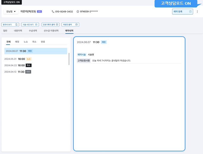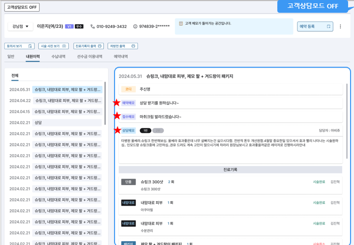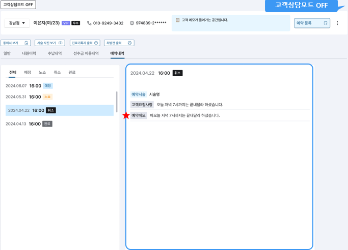 접수/예약 메모 등 직원이 직접 작성한 내용들이 고객으로 하여금 민감한 소지가 될 수 있는 점을 감안하여 이를 사전에 방지할 수 있도록 고객상담모드 ON/OFF 기능이 생성되었습니다.