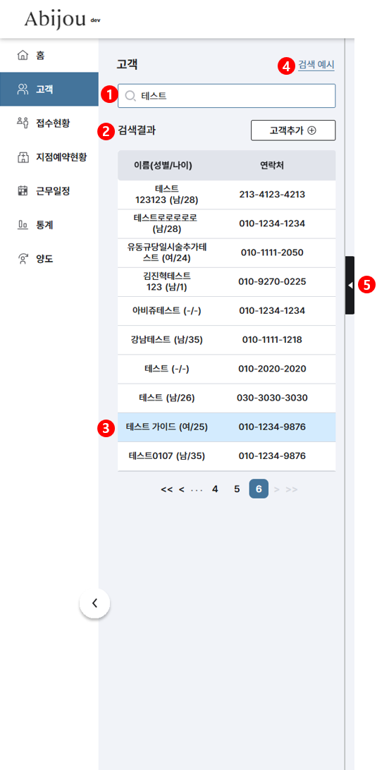 검색 입력창 고객 검색 조건 입력 후 Enter 시, 검색 결과 영역에 해당 조건에 맞는 검색 리스트가 노출됩니다.