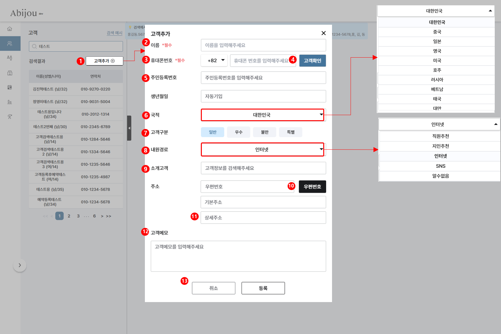 고객 추가 버튼을 클릭하면 추가 팝업창이 나타납니다.