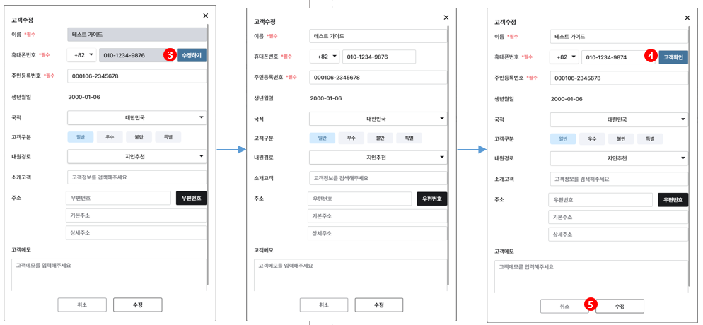 점 3개 아이콘을 클릭 시, [고객 정보 수정] 버튼이 노출됩니다.