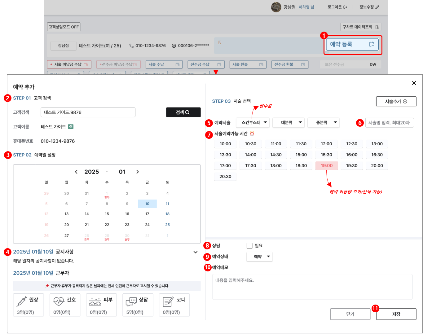 단! 예약 허용량이 초과한 시술에 대해서는 원내 상황에 따라 시술 진행이 어려울 수 있다는 점을 미리 고객에게 고지해주세요!