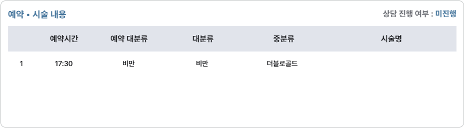 예약 시술 : 예약 추가에서 선택한 시술의 예약대분류, 대분류, 중분류만 표기됩니다.