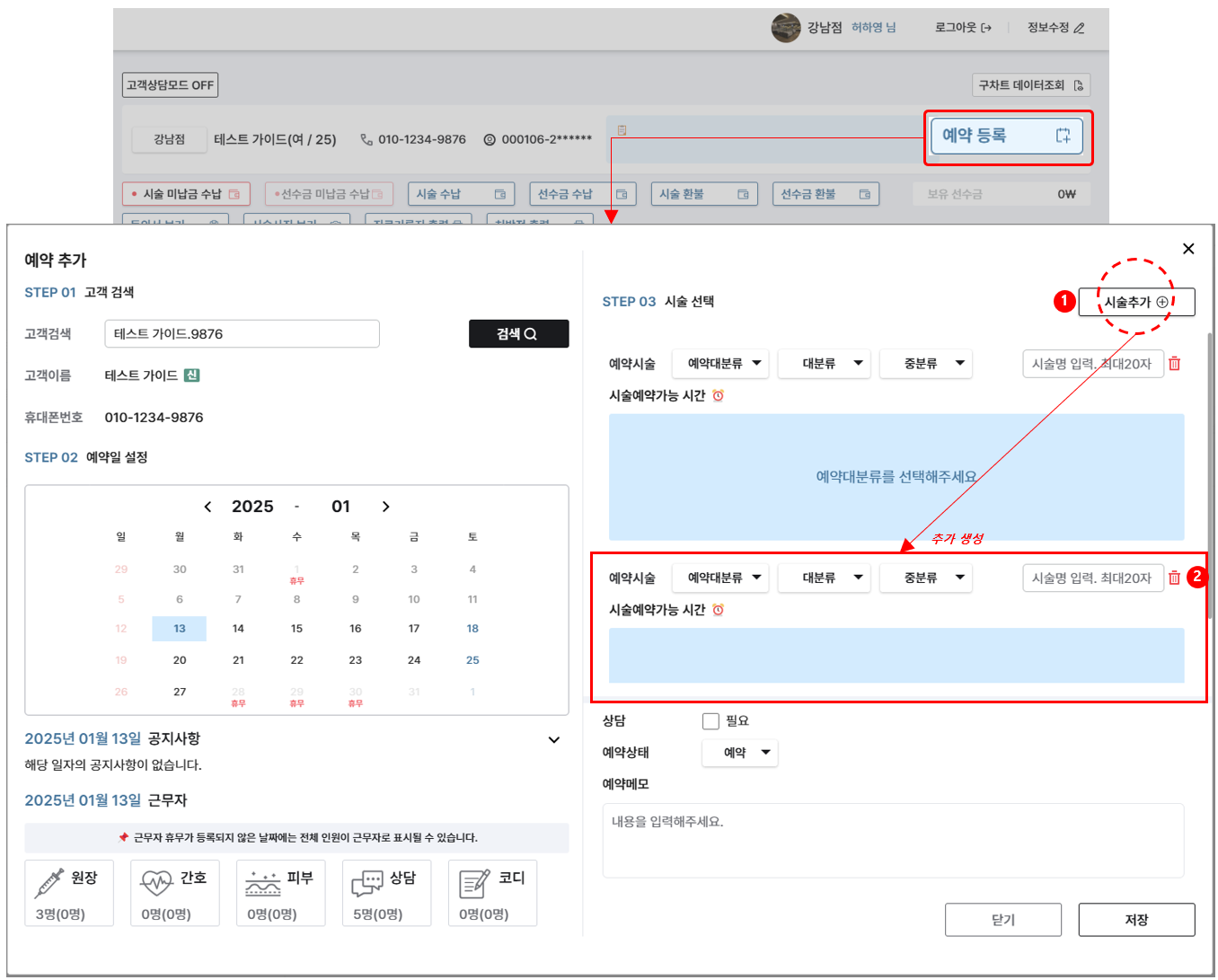 한 개의 예약 건에 다 건의 시술 예약이 필요할 경우, [시술 추가] 버튼을 통해 여러 개의 시술을 한번에 예약할 수 있습니다.