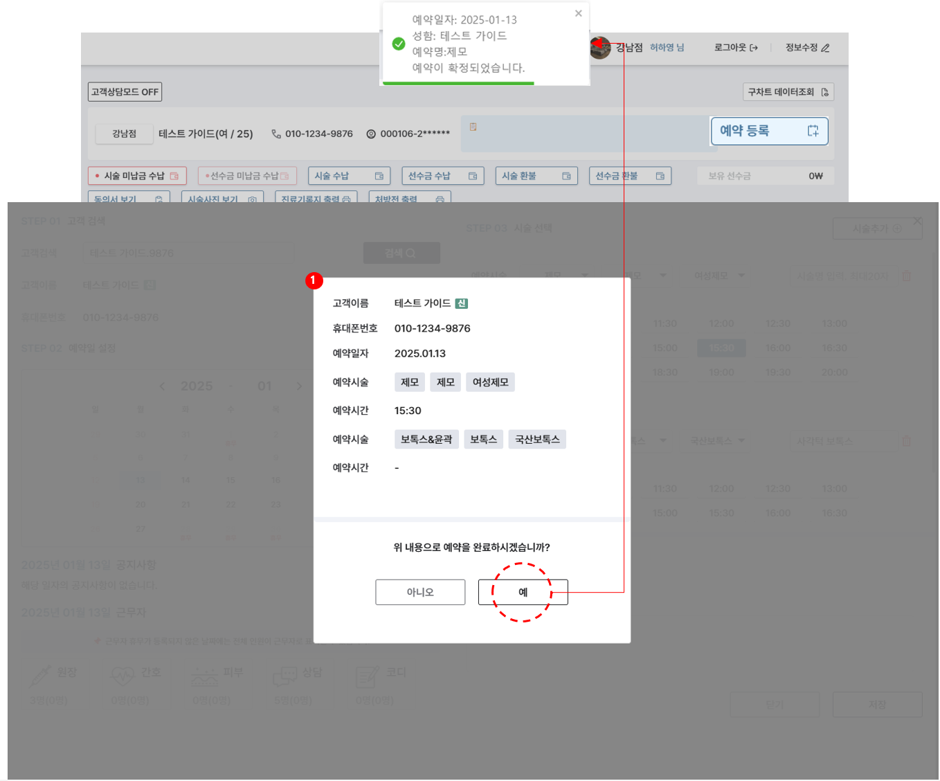 예약 내용 최종 확인 후 [예] 버튼 클릭 시, 예약이 최종 확정됩니다.