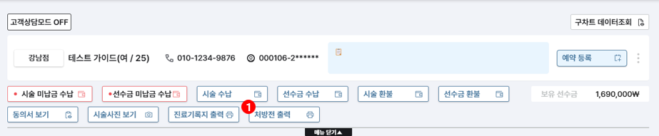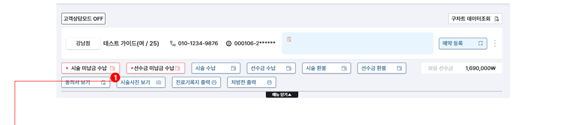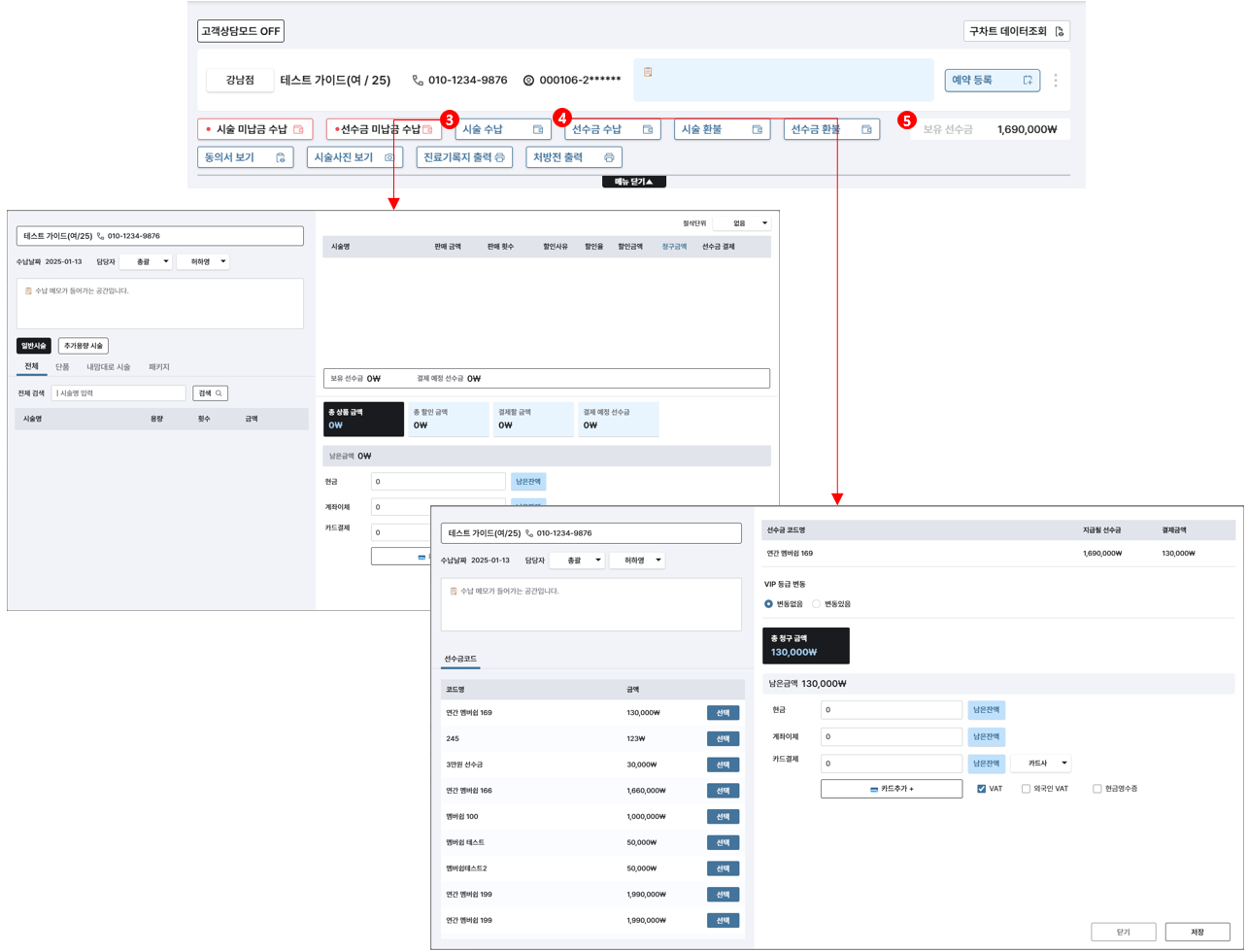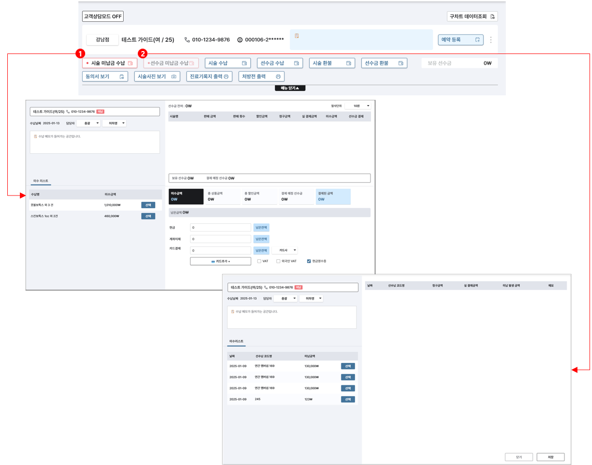 [메뉴 경로: 차트 > 고객 > 고객 상세 > 시술/선수금 미납금 메뉴]