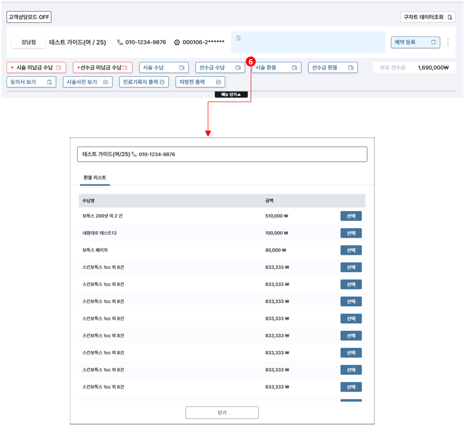 버튼 클릭 시, 시술 환불 팝업창이 호출됩니다.