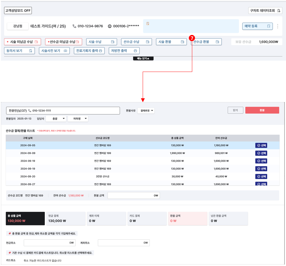 [메뉴 경로: 차트 > 고객 > 고객 상세 > 선수금 환불 팝업창]