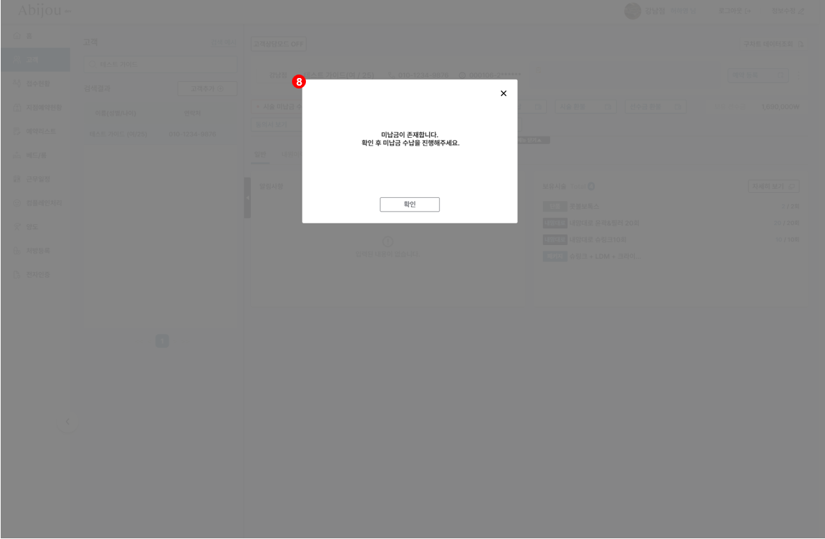 미납금이 있는 고객의 상세페이지 접근 시, 좌측 이미지와 같이 팝업이 호출됩니다.
