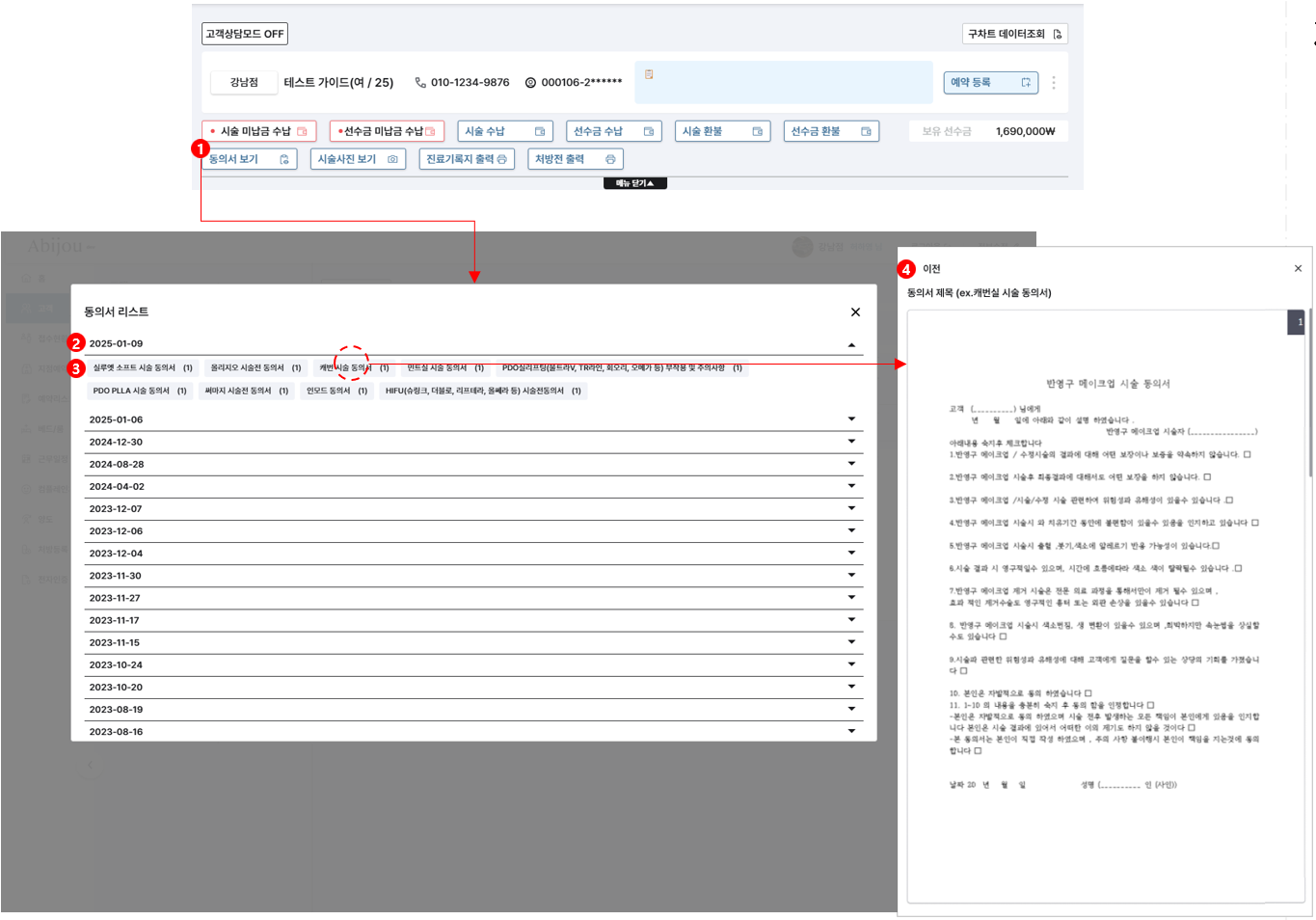 동의서 항목 선택 시, 동의서 내용이 호출됩니다.