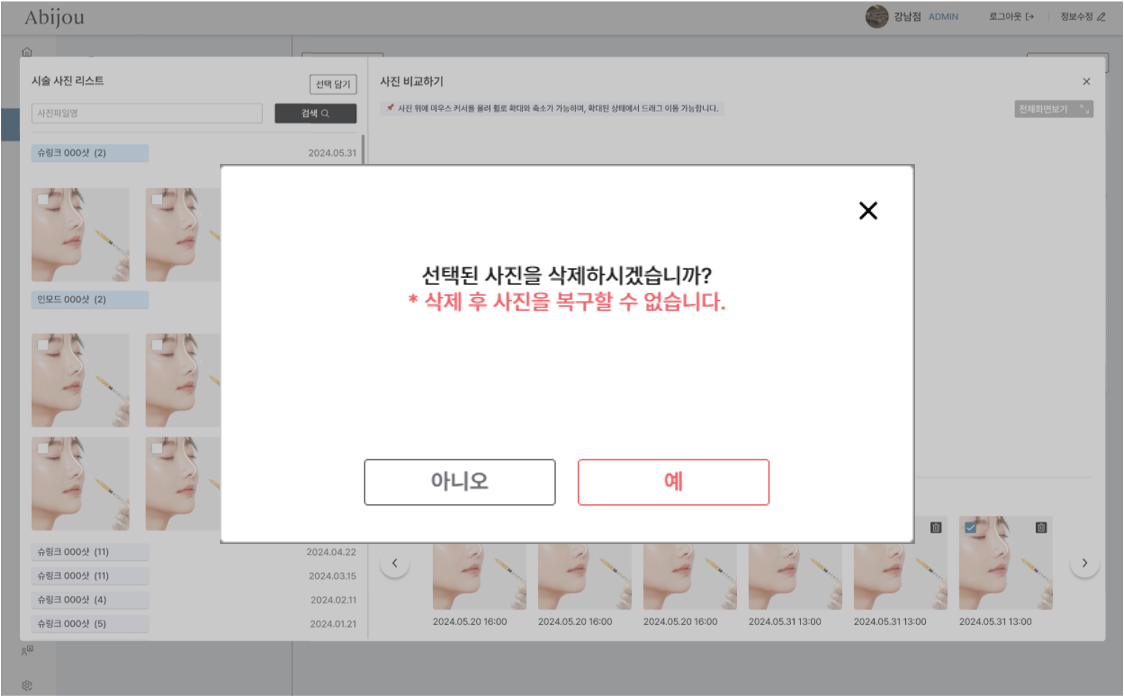 휴지통 아이콘 클릭 시, 사진 비교하기 리스트에서만 삭제되며, 시술 사진 리스트에는 계속해서 존재합니다.