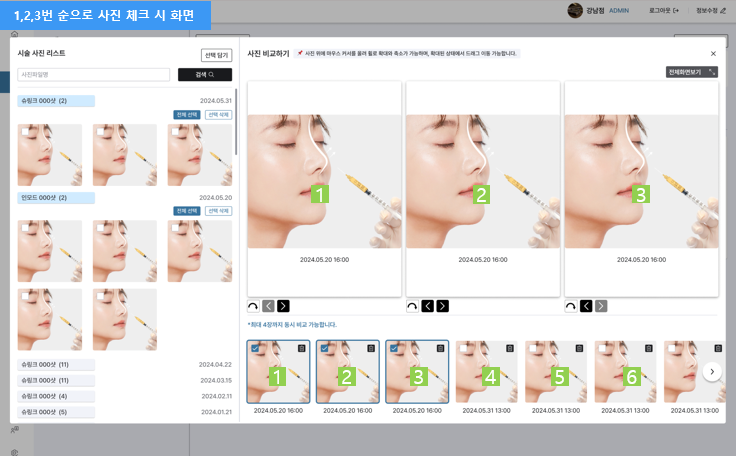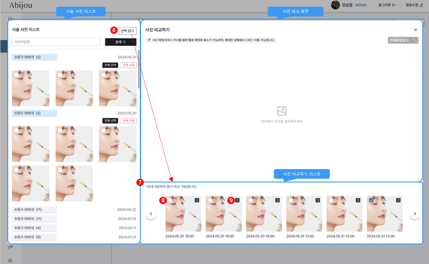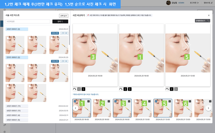 [선택 담기] 버튼 클릭 시, 시술 사진 리스트에서 선택된 사진이 사진 비교하기 리스트에 담겨집니다.