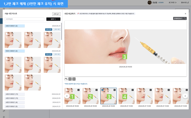 사진 좌측의 체크박스를 통해 비교할 사진을 선택/해제가 가능합니다.