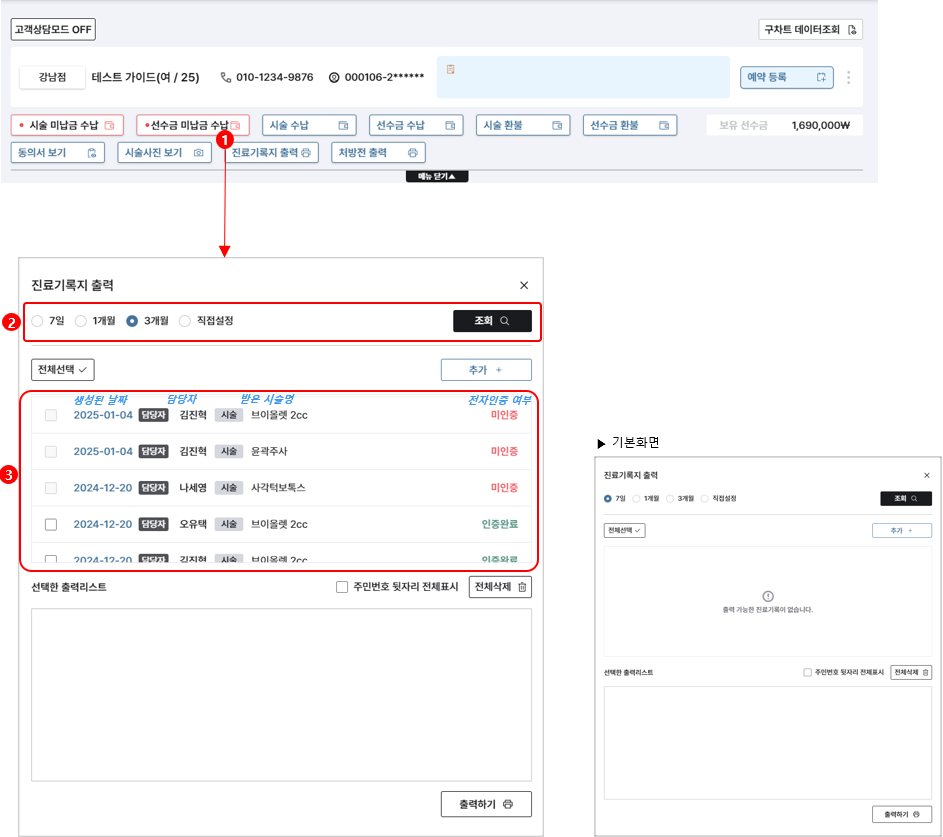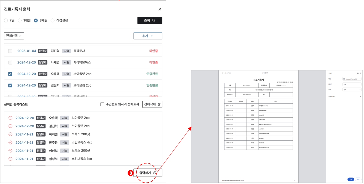 •고객 요청이 있을 경우, 해당 기능을 통해 진료기록지 출력이 가능합니다.