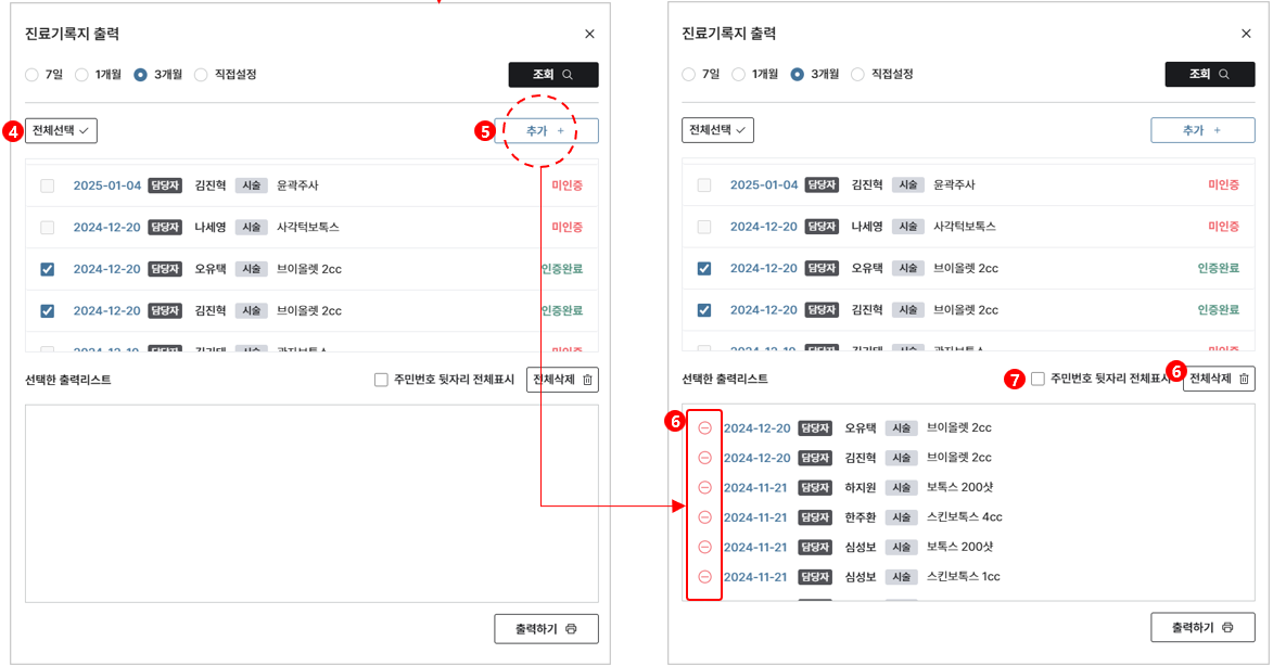 전체 출력: 처방전 출력 리스트의 모든 항목 출력