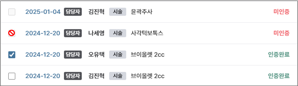 리스트 내용 : 생성된 날짜 + 담당자 + 받은 시술명 + 전자인증 여부