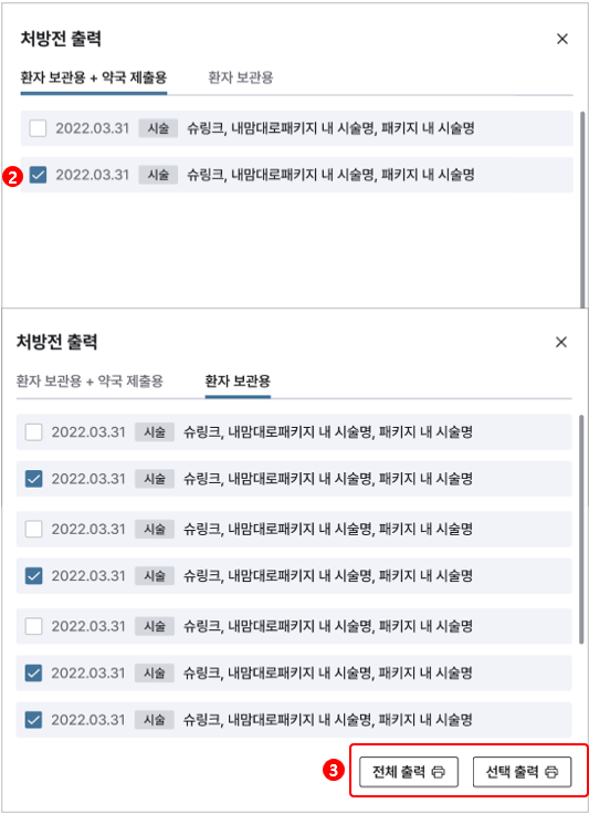 : 환자 보관용, 약국 제출용 2장 모두 출력할 경우
