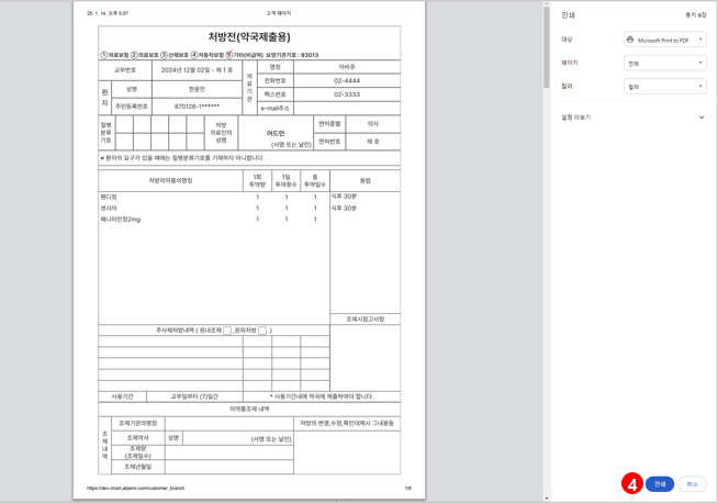 처방전 출력 화면 팝업창 내, 인쇄 버튼을 클릭해 처방전을 출력합니다.