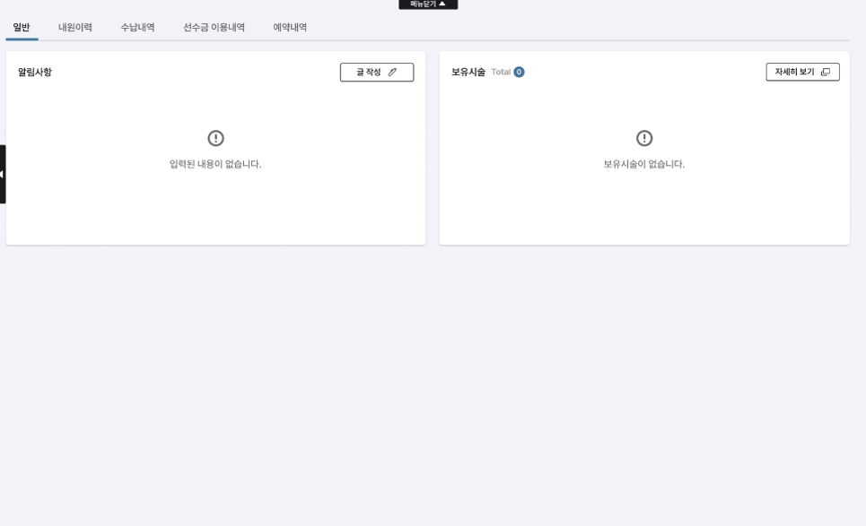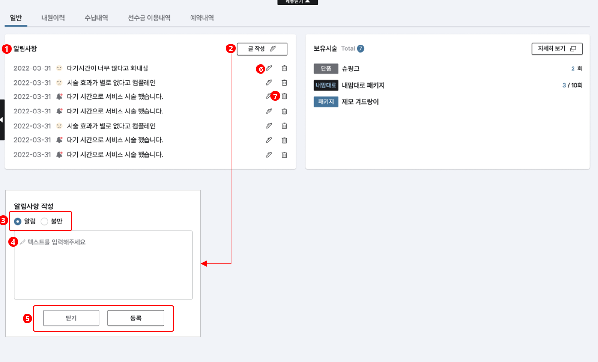 일반탭에서는 알림사항 확인/작성 및 보유시술을 확인할 수 있습니다.