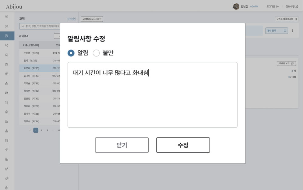 선택한 리스트의 예약 시간, 예약 시술명, 고객 요청 사항, 예약 메모가 표기됩니다.