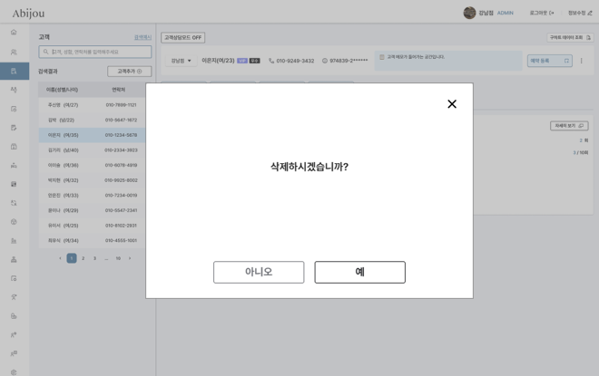 삭제 아이콘 클릭 시, 삭제 여부 확인 안내창이 호출됩니다.