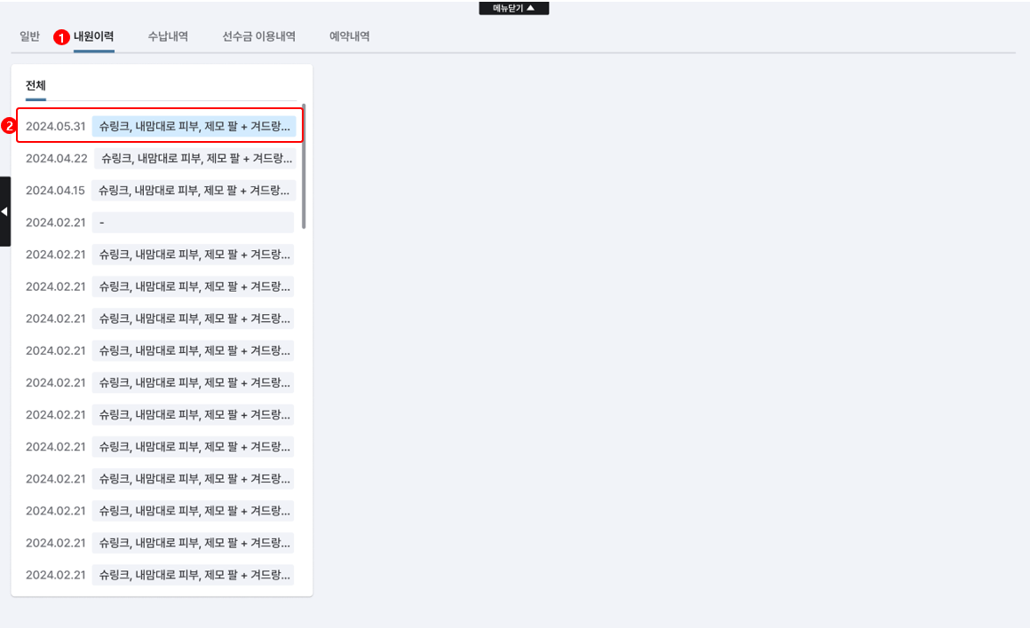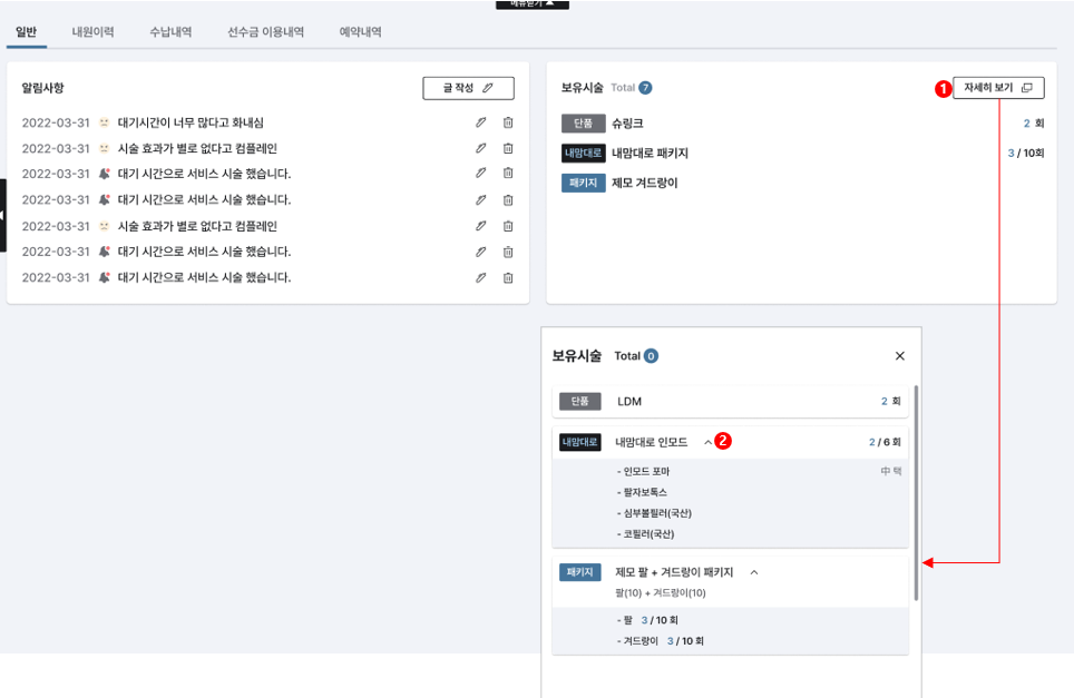고객이 보유하고 있는 보유시술 종류 및 총 횟수/개별 횟수를 확인할 수 있습니다.