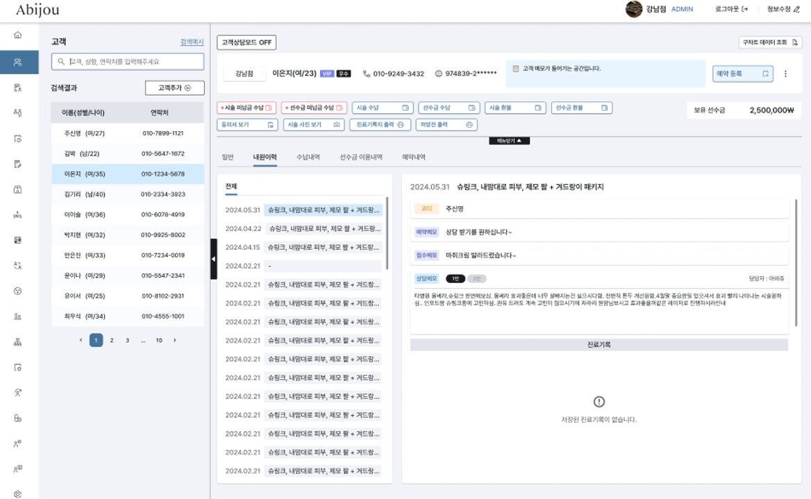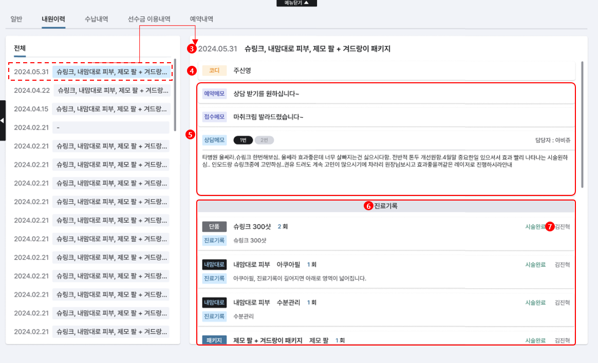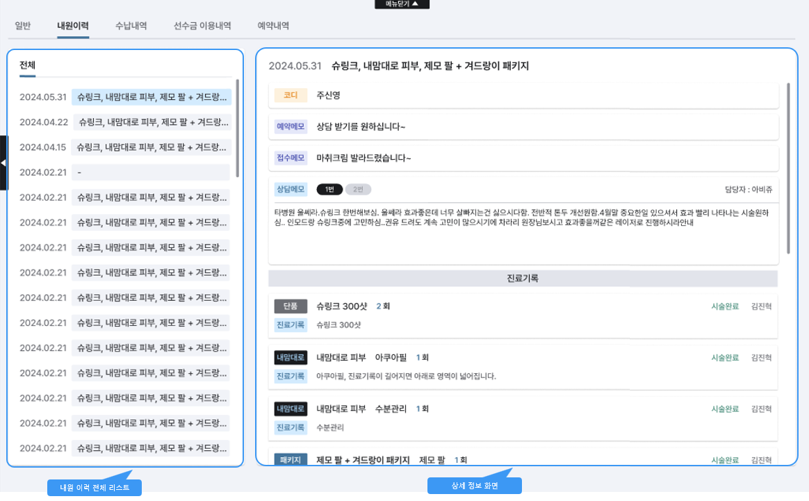 고객의 내원 이력(진료기록, 시술 담당자, 예약/접수/상담 메모 등)을 확인할 수 있습니다.