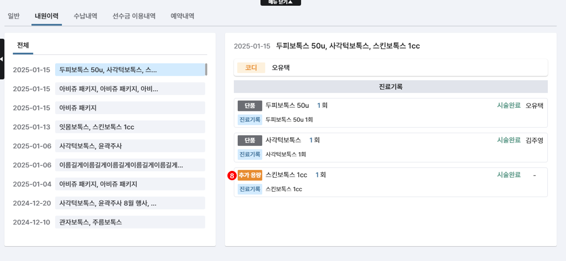 진료기록 리스트 내, ‘추가용량‘ 시술을 진행한 이력이 있을 경우, 진료기록 리스트 제일 하단에 노출됩니다.