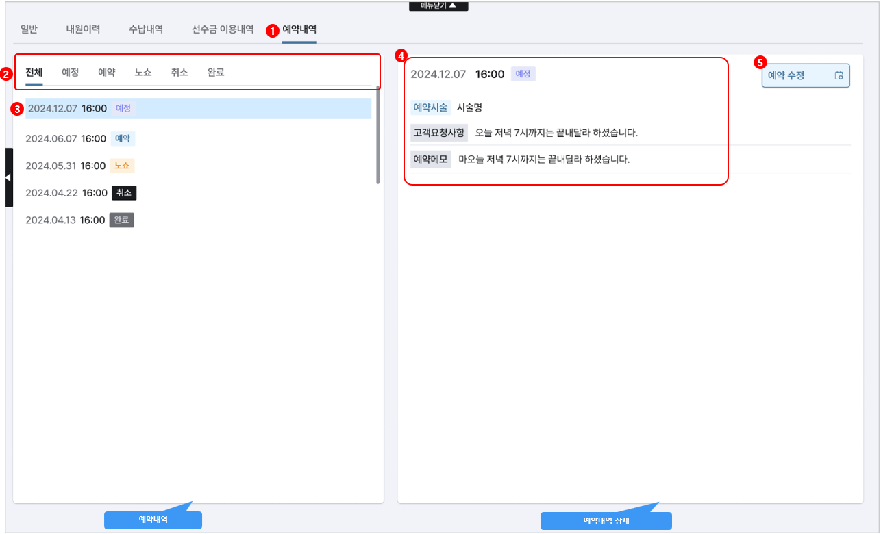 [메뉴 경로: 차트 > 고객 > 고객상세 > 예약내역탭]