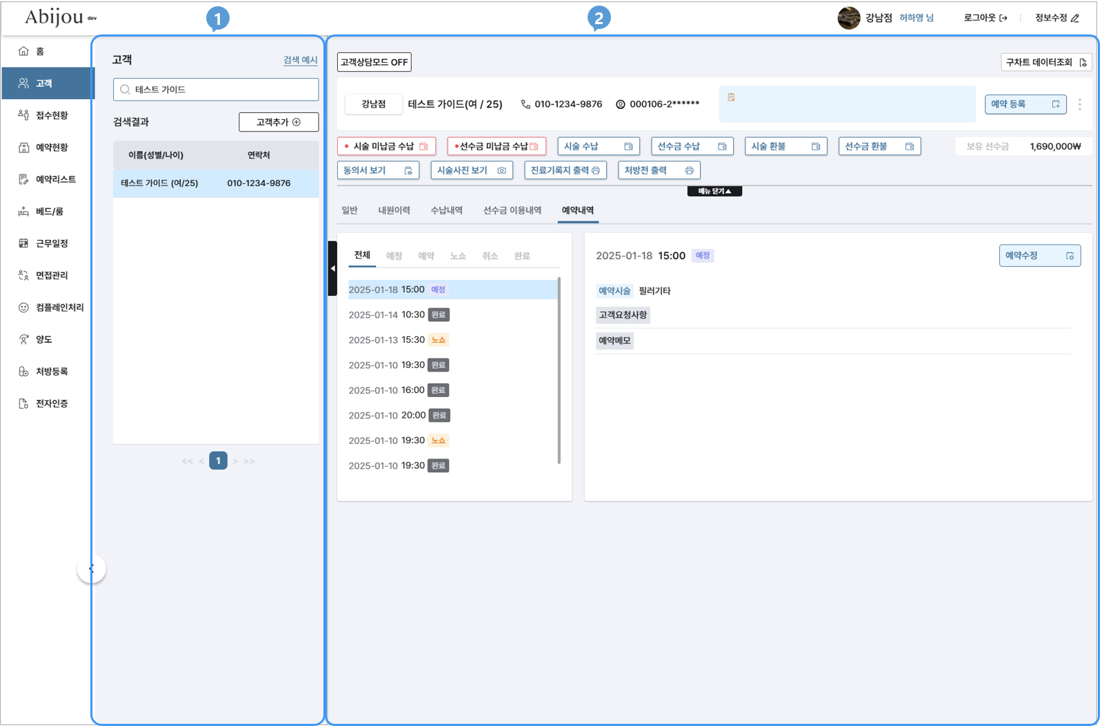 고객 페이지에서는 '고객 검색'을 비롯한 고객 기본 정보, 예약 등록(수정), 수납/환불, 처방전 출력, 내원(예약) 내역 확인 등의 기능을 제공합니다.