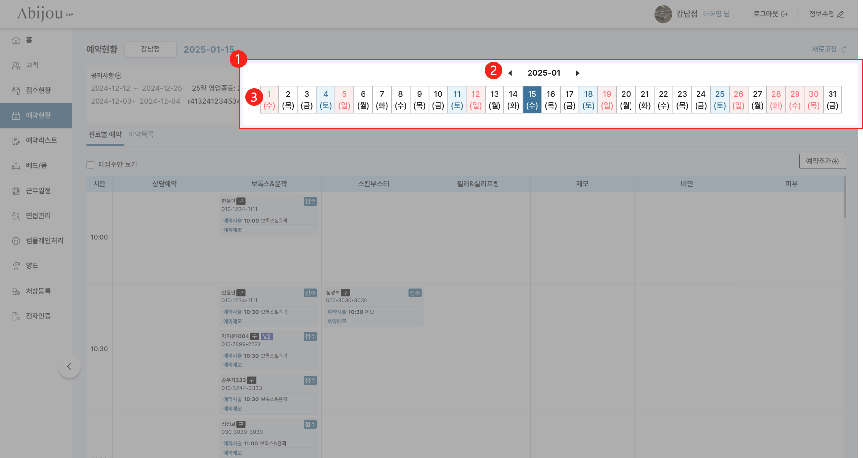 달력달력확인하고자 하는 날짜를 선택하여 예약현황을 날짜별로 확인할 수 있습니다.기간별 X달력 첫 화면로그인하여 예약현황 메뉴에 처음 진입했을때 날짜는 오늘 날짜로 설정됩니다.월 이동(설정)이동하고자 하는 날짜의 월을 좌우 화살표를 이용하여 이동할 수 있습니다.일 이동(설정)이동하고자 하는 날짜의 일을 표에서 선택하면 해당 날짜로 이동할 수 있습니다.