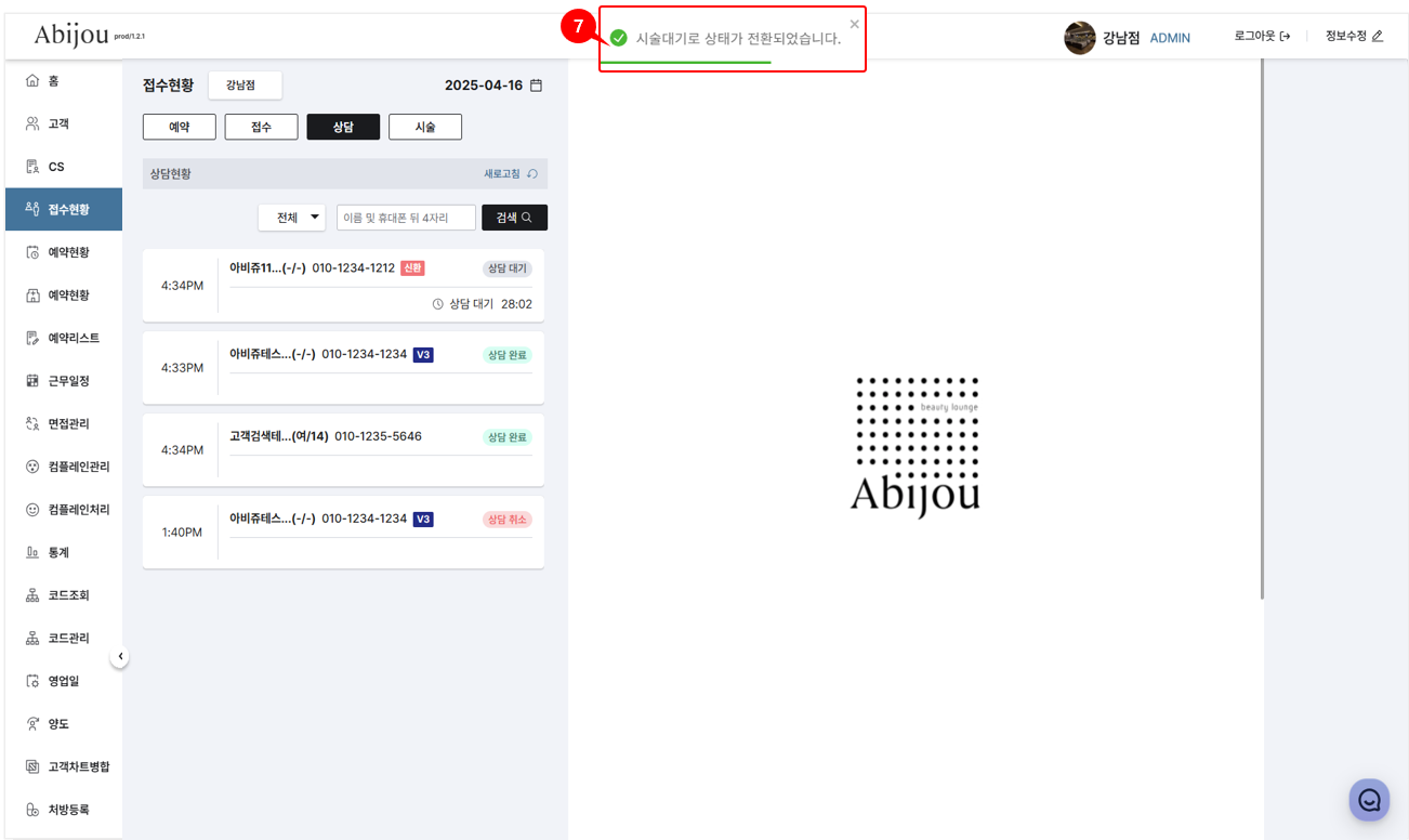 이때 고객은 상담취소가 되며 시술대기 상태로 바로 전환됩니다.
