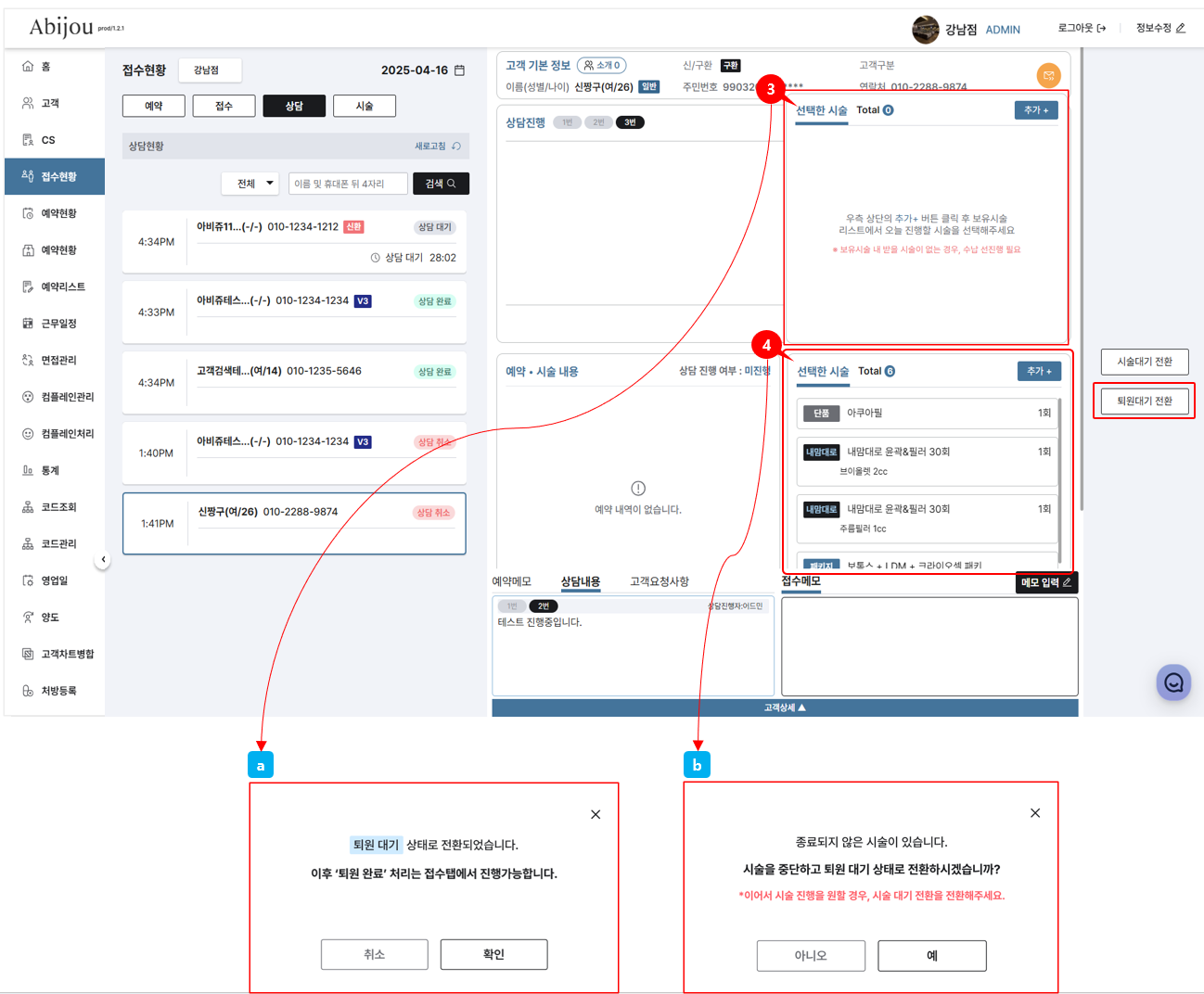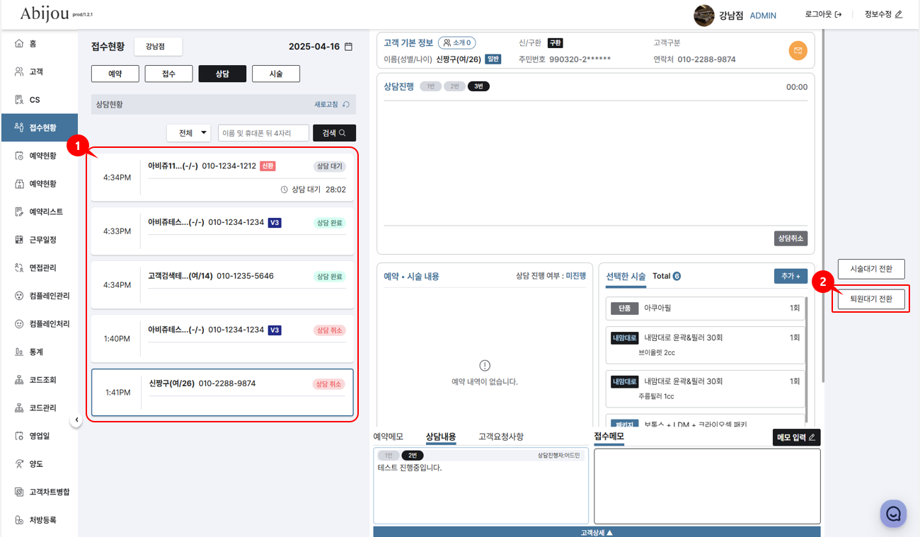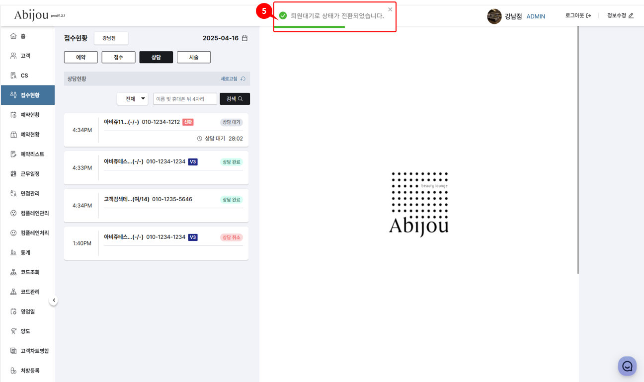 *상담탭에서 퇴원대기로의 상태전환한 고객은 상담탭 내 고객리스트에서 사라지며,해당 고객은 접수탭 내 고객리스트에서 확인이 가능합니다.