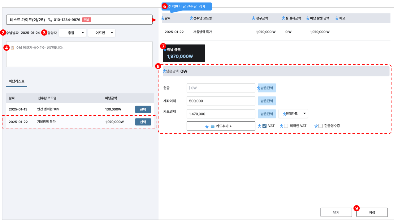 2)선수금 미납금 수납 진행 시, 결제 금액을 입력하지 않을 경우 저장 불가합니다.