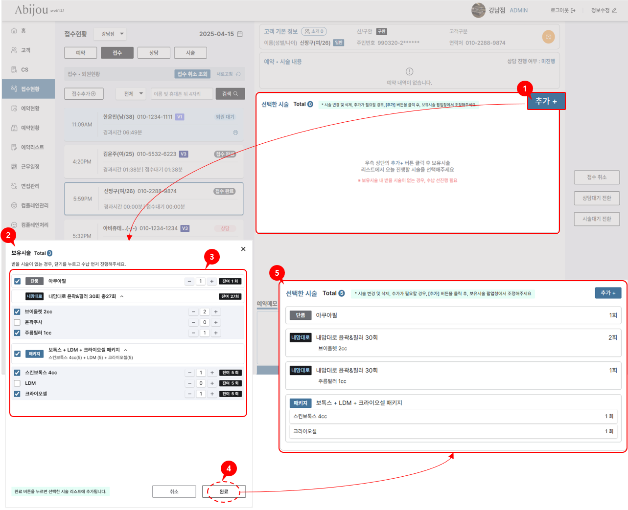 [완료] 버튼 클릭하여 선택한 시술 추가하기를 완료합니다.