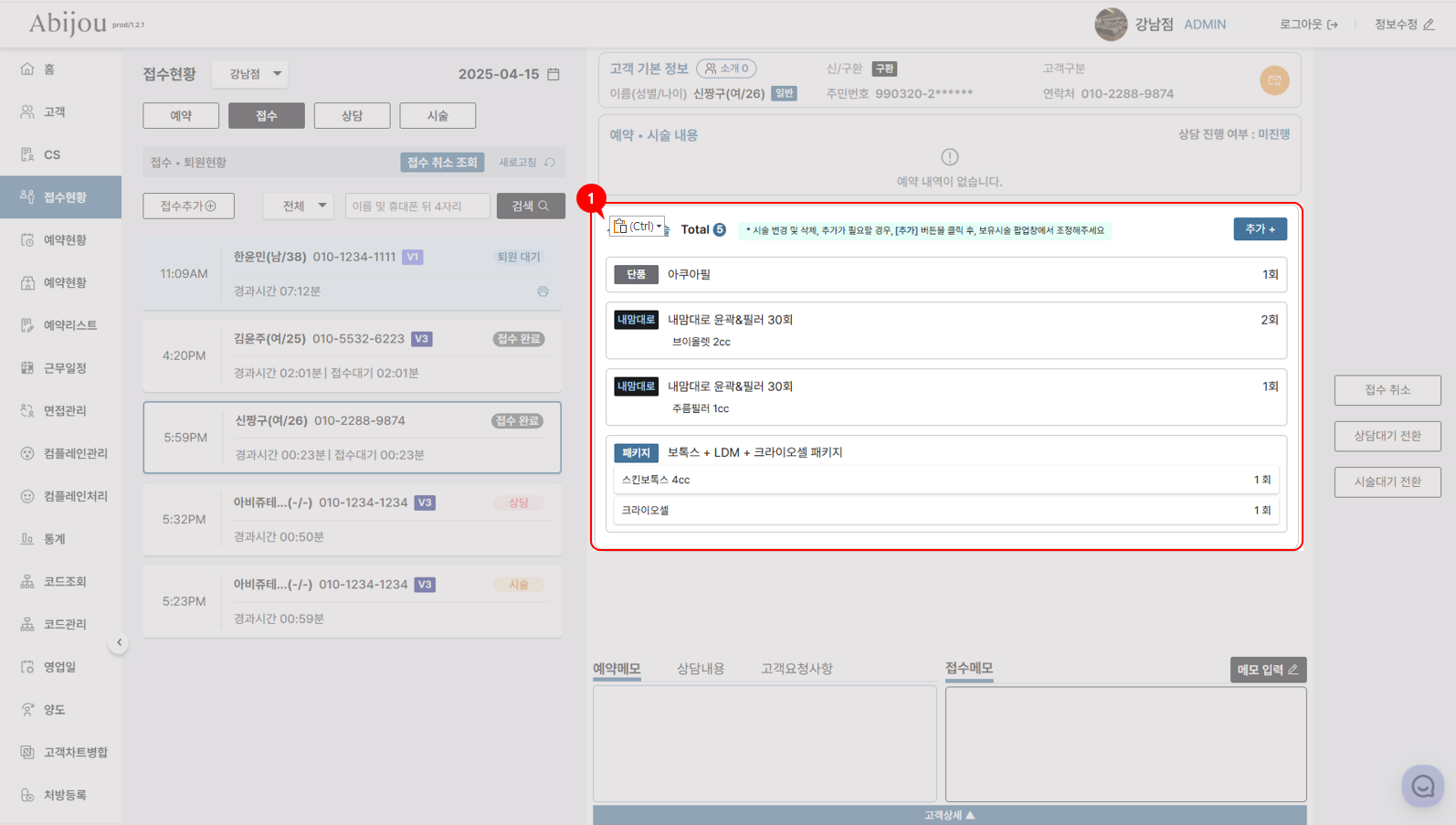 선택한 시술에 시술이 추가되어 있는 화면입니다.