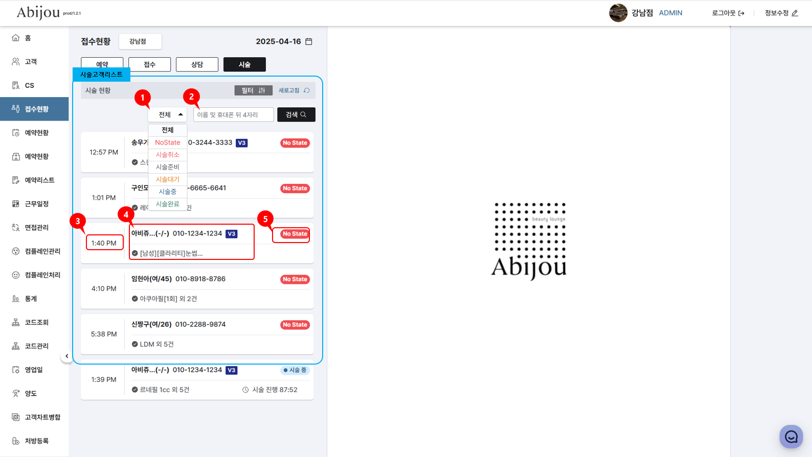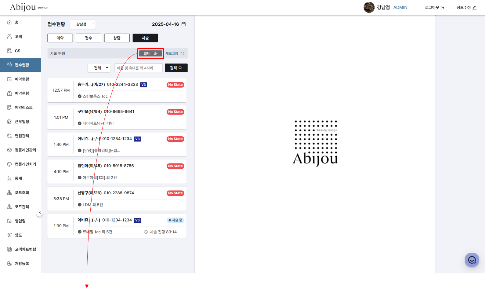 ex) 'A 고객'이 다 건의 시술 진행 시, 여러 시술 상태 중에 '시술중' 상태가 1개 이상 존재할 경우, '시술준비' 혹은 '시술완료' 상태가 존재해도 리스트에는 '시술중'인 상태가 메인 상태로 표기됩니다.