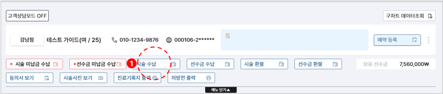 시술 수납 미납금은 [차트>고객>고객상세>시술 미납금 수납]메뉴에서 이어서 수납 처리가 가능합니다.