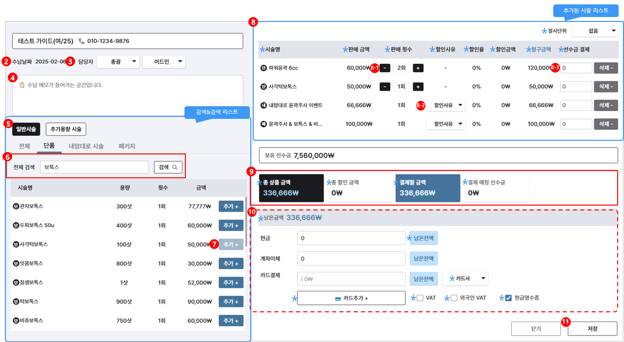 고객이 시술을 받기 위해 결제하는 전반적인 과정으로 고객이 원하는 시술 코드를 선택하여 수납을 통해 시술을 구매할 수 있습니다.