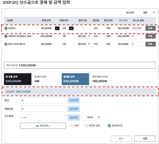 ▶선수금 결제 : 각 시술 항목 별, 보유하고 있는 선수금 사용 시, 사용 금액 입력
