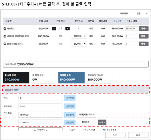▶남은금액 : 결제할 금액 – {결제 예정 선수금 + 현금 + 계좌이체 + 카드 결제}