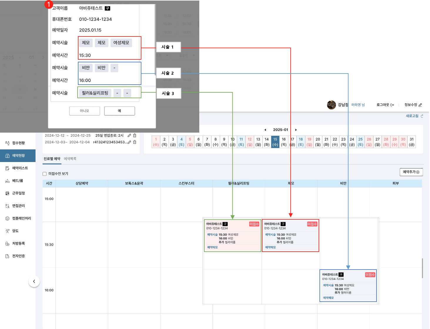 → 예약한 시술이 해당하는 예약대분류와 예약한 시간에 해당하는 칸에 예약테이블 내에 카드형식으로 예약내용이 보여집니다. 여러 건의 시술을 한번에 예약한 경우 예약대분류 + 예약한 시간 으로 카드가 생성됩니다.