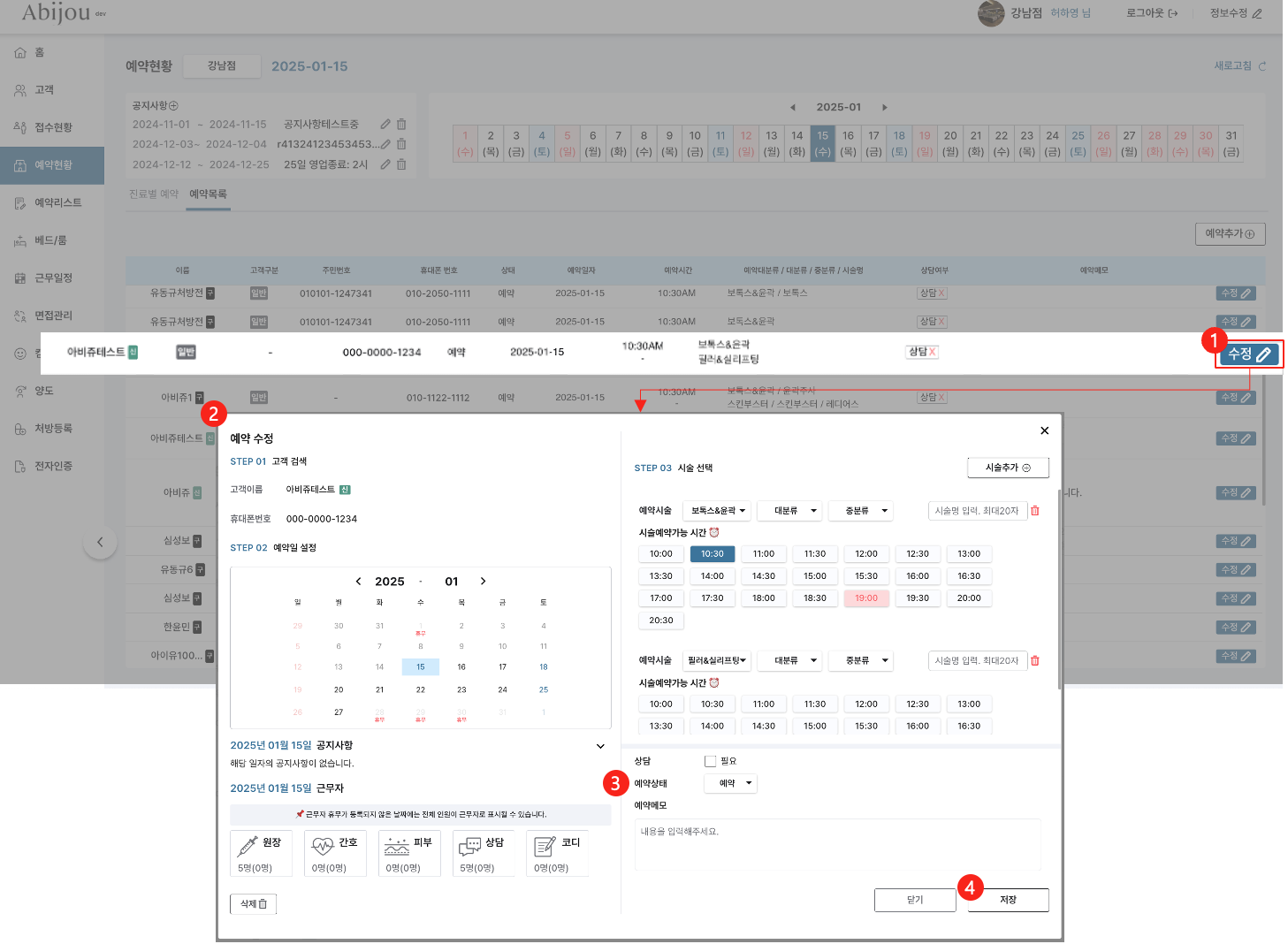 예약을 수정하고자 하는 고객리스트 우측에 수정 버튼을 클릭하세요.