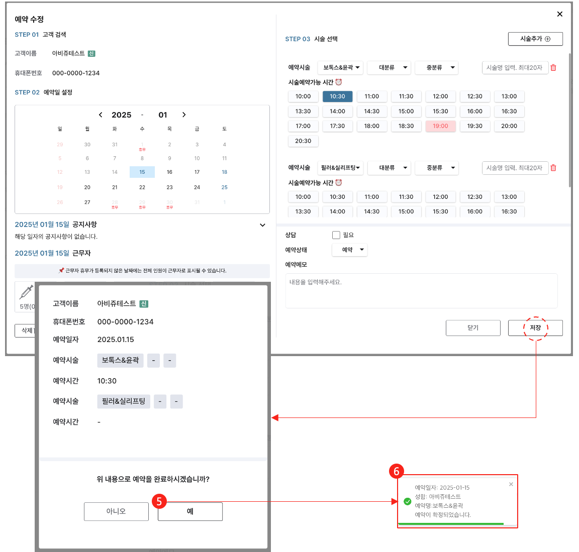 수정이 다 끝났다면 [저장]버튼을 클릭하여 수정한 예약내용을 저장합니다.