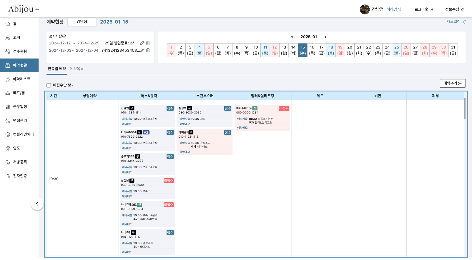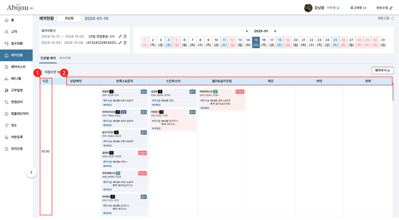 → 예약내용을 예약대분류&예약시간대별로 카드 형식으로 확인할 수 있는 화면입니다.