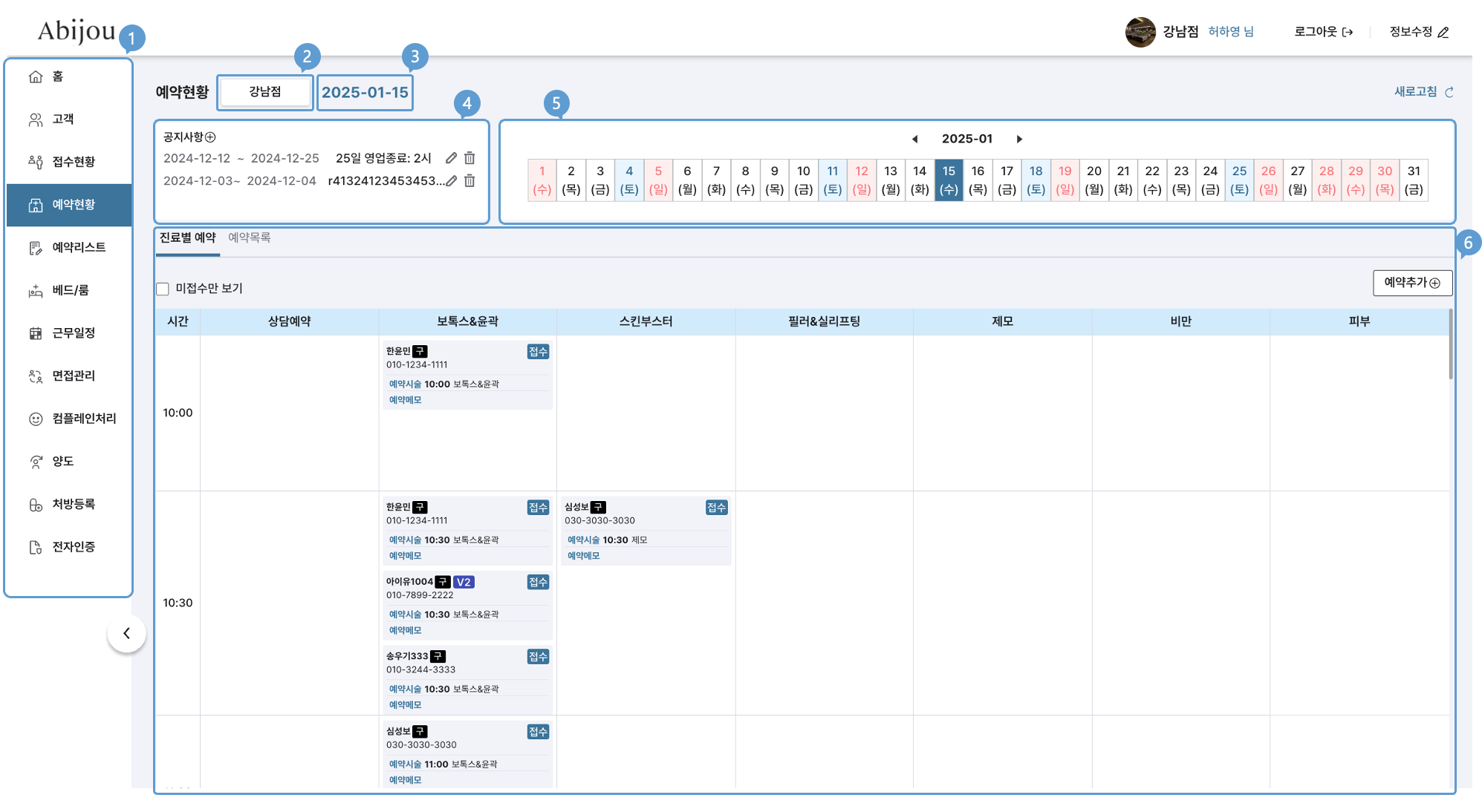 5번 달력에서 선택한 날짜의 예약 현황을 탭 선택을 통해 예약현황 및 목록을 2가지 버전으로 확인 할 수 있습니다.