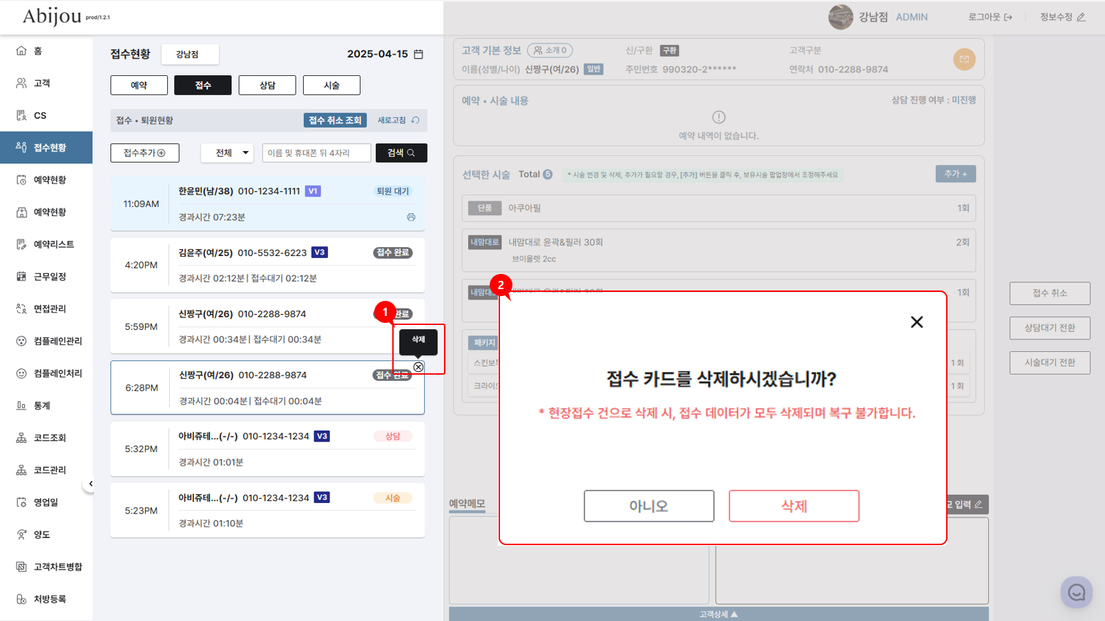 좌측 리스트에서 상태가 접수 완료인 고객 중 접수를 삭제하고자 하는 고객카드 위에 마우스 커서를 올려놓으면 우측에 X버튼이 보입니다.