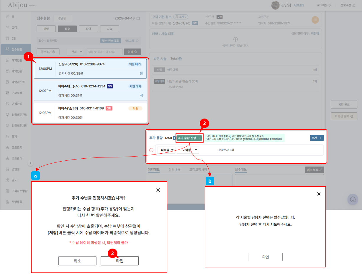 '추가 수납' 진행 이전에 '추가 용량' 시술의 담당자 설정은 필수입니다.
