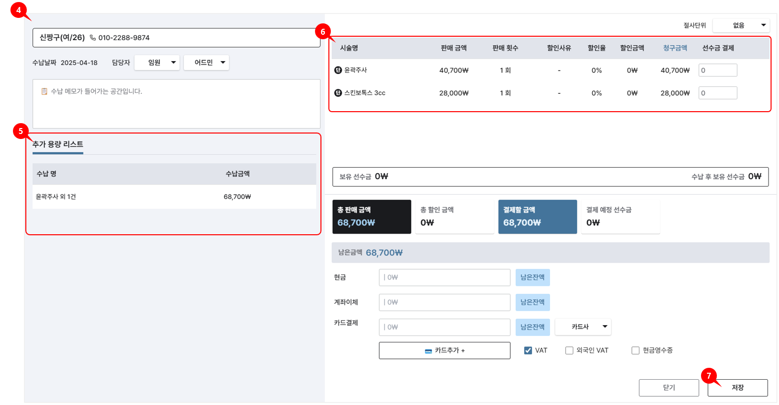 추가 용량 영역에 추가된 시술이 있는 경우 추가 수납 진행 버튼 클릭하세요.