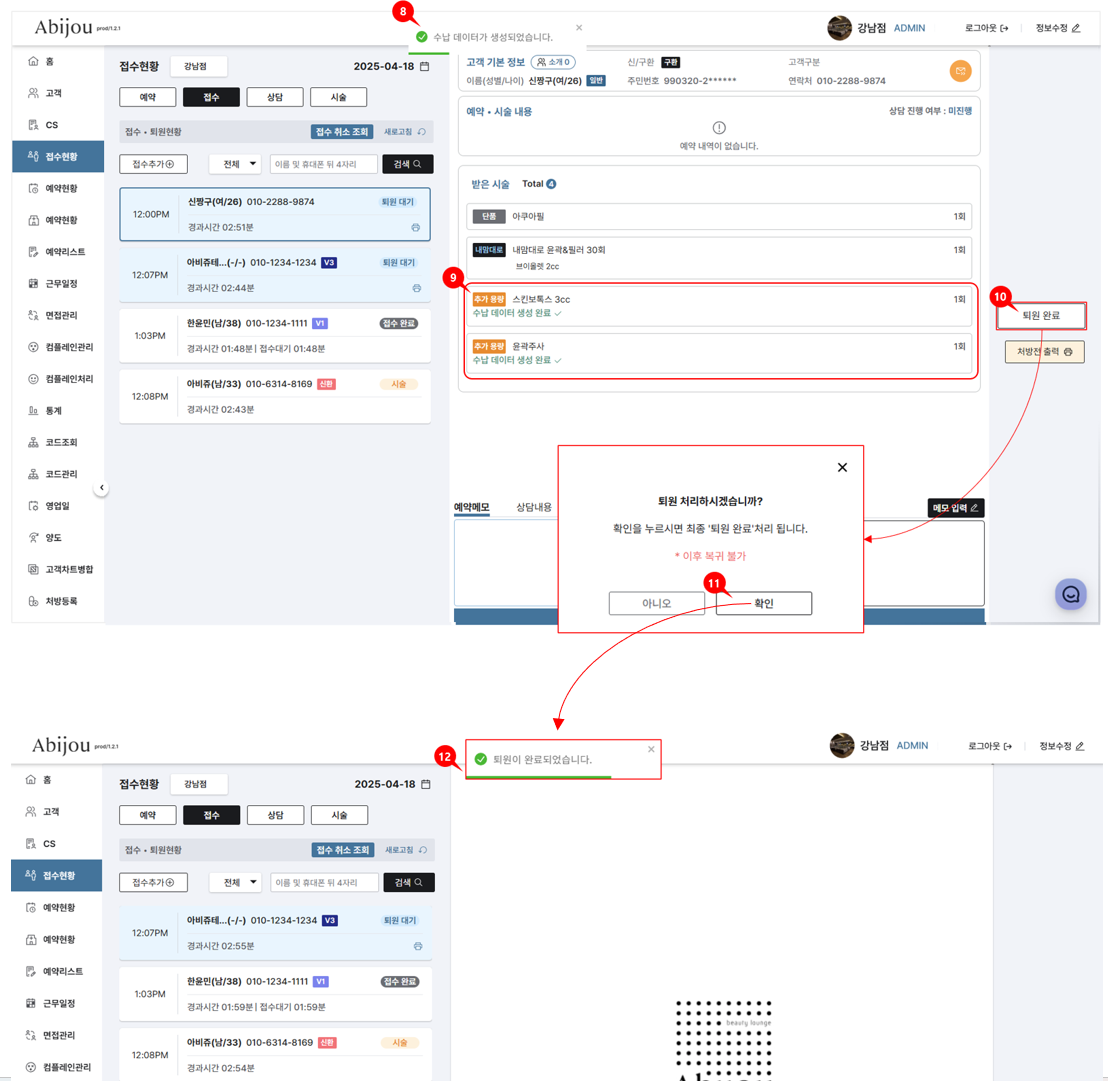 “퇴원이 완료되었습니다.” 라는 문구가 뜬다면 퇴원 완료로 상태 전환이 완료 됩니다.이때 리스트에서 해당 고객은 사라집니다.