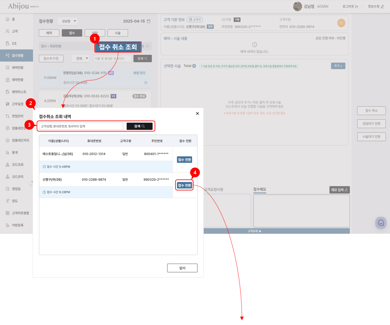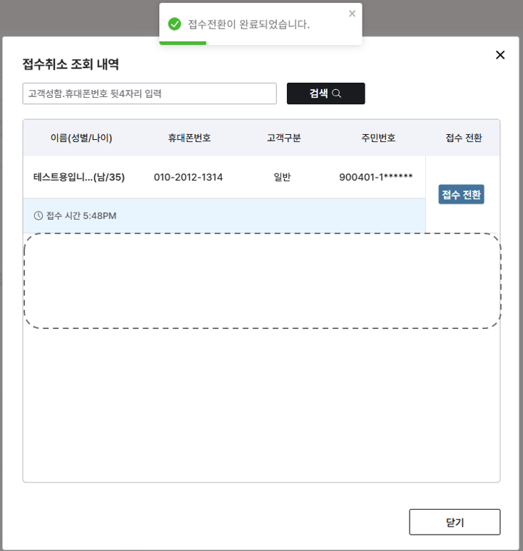 접수로 전환하고자 하는 고객 리스트 우측에 접수 전환버튼 클릭해주세요.